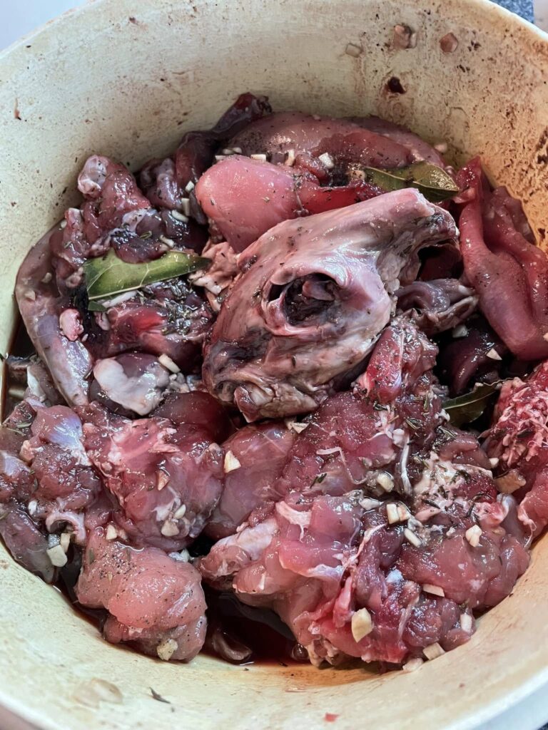 Coloque o coelho num alguidar com alho, vinho branco, louro, ervas aromáticas, sal e pimenta.