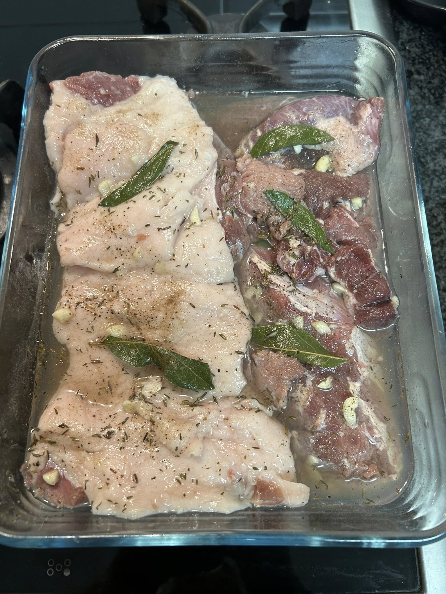 Tapa e deixa a marinar mínimo 12 horas no frio (quanto mais tempo, mais macia a carne).